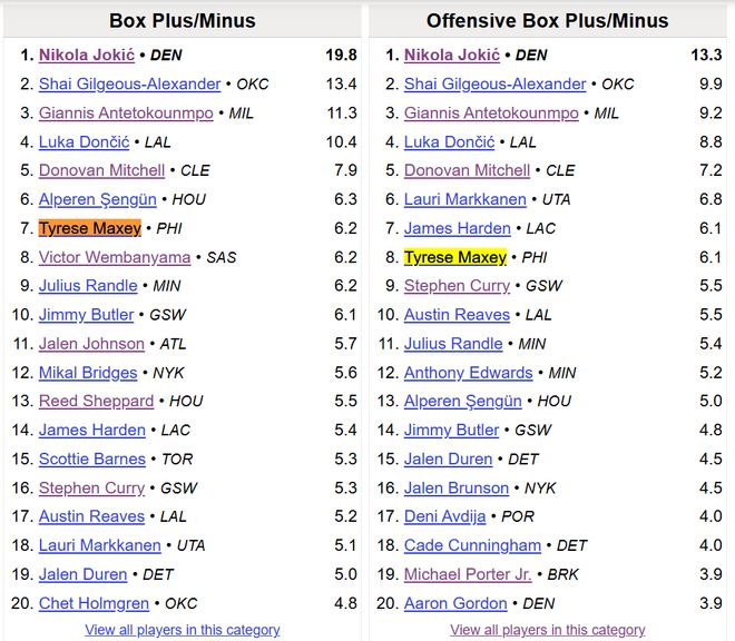 BBR的高阶数据,马克西的PER值、WinShare、VORP(不可替代值)、BPM分别排在联盟第12、第7、第6、第7,多项数据后面跟的还是库里、文班这样的大佬。